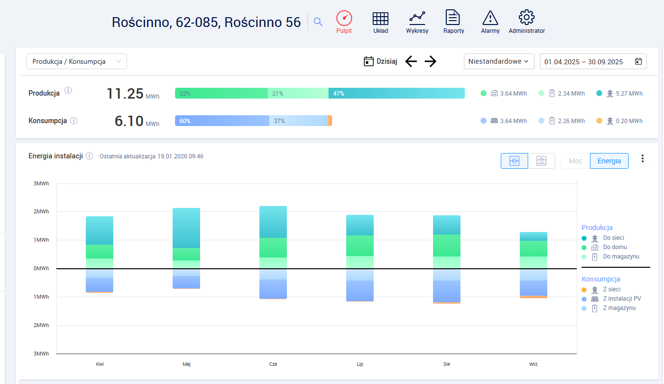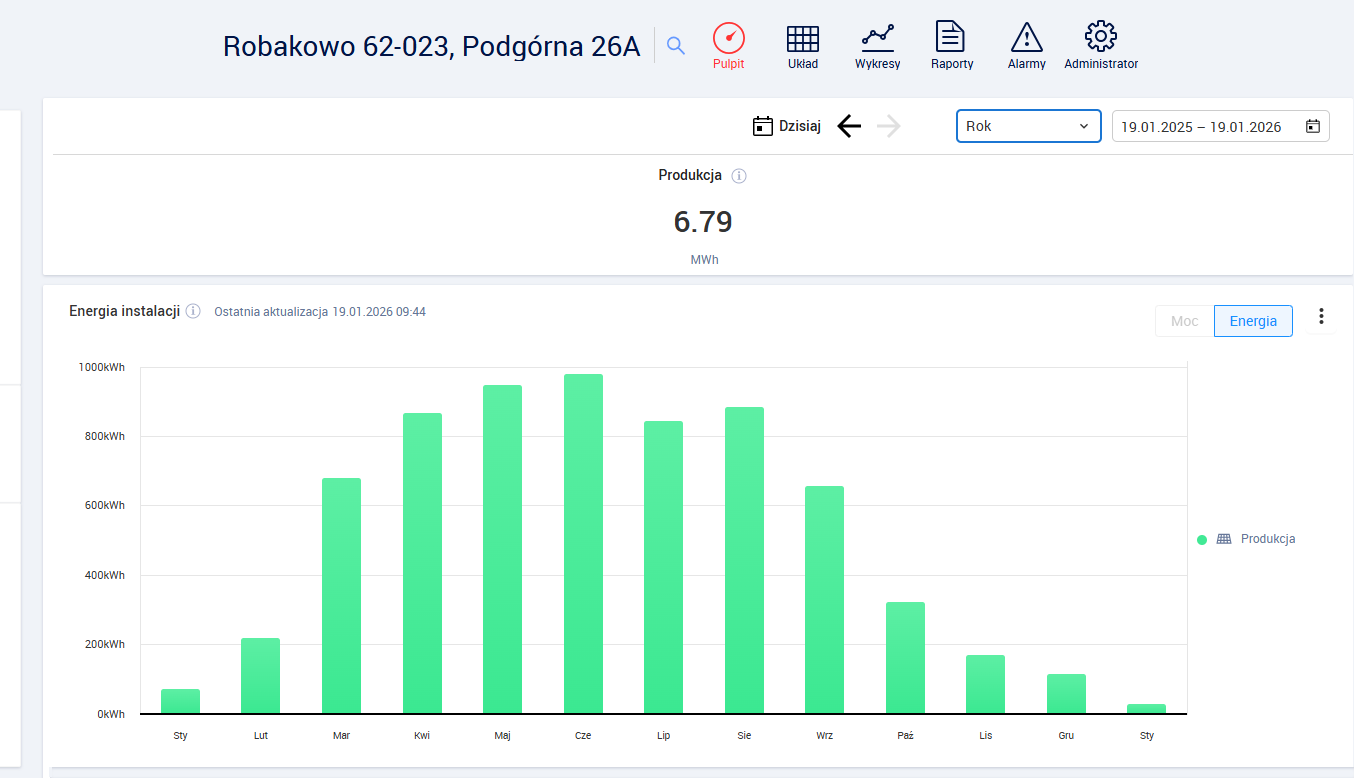 Wykresy produkcji instalacji fotowoltaicznej w Robakowie
