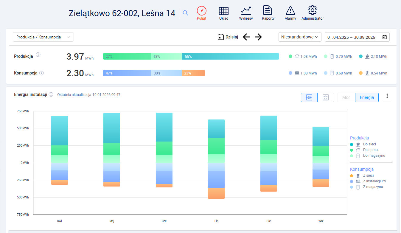 Wykresy produkcji instalacji fotowoltaicznej w Zielątkowie